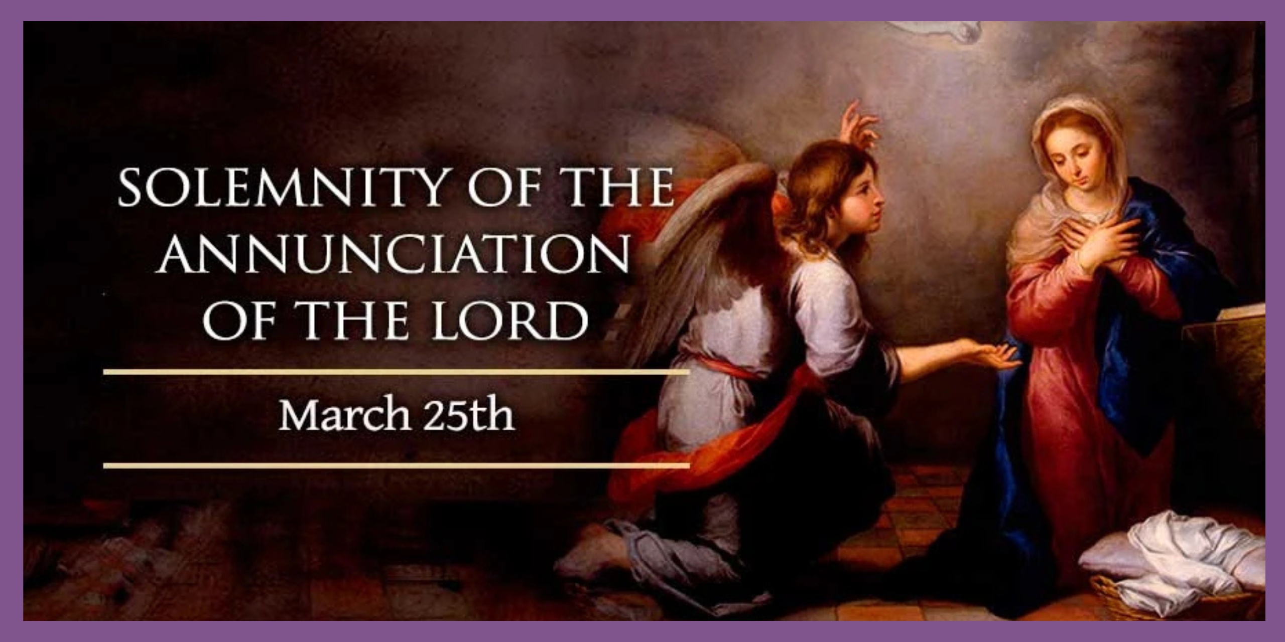 This Wednesday is the Solemnity of the Annunciation of the Lord. The Angel Gabriel greets Mary and asks her to be the mother of God. We will have Mass in English on March 25th at 8:15 a.m. in Holy Name Church to commemorate the feast. Exactly nine months later, we will celebrate Christmas Day!